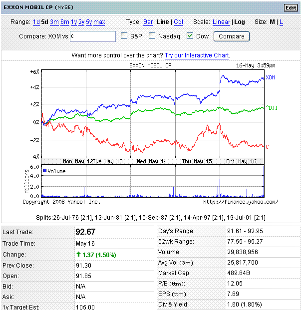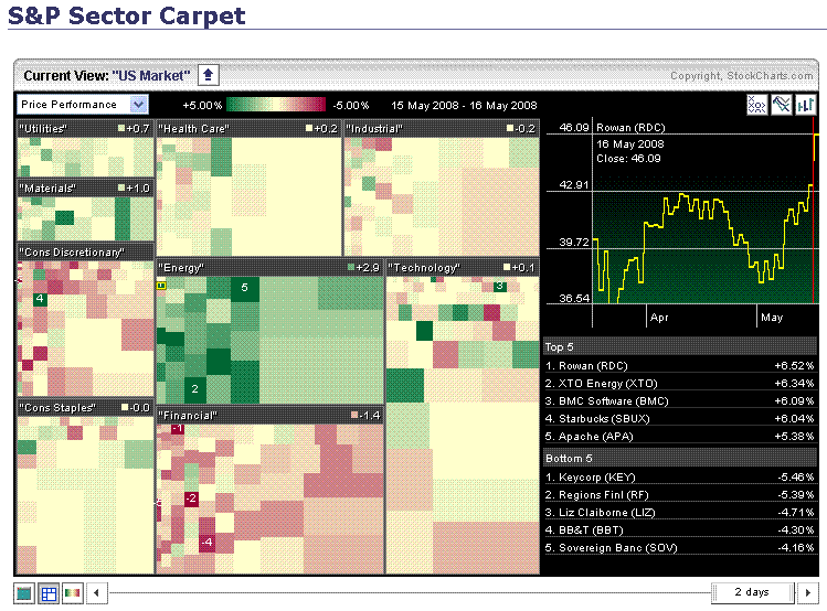 消費者信頼感指数の低迷を受けて序盤は売られましたが、原油高からエネルギーセクター、素材セクターが買われ株価指数は引けにかけて戻しました。先週1週間のエクソンモービルとシティの動きを比べたり(画像1)、先週金曜のセクターごとの騰落状況をみると(画像2)、資源関連が買われていたのがはっきりとわかります。NY原油は、取引時間中の高値を更新。