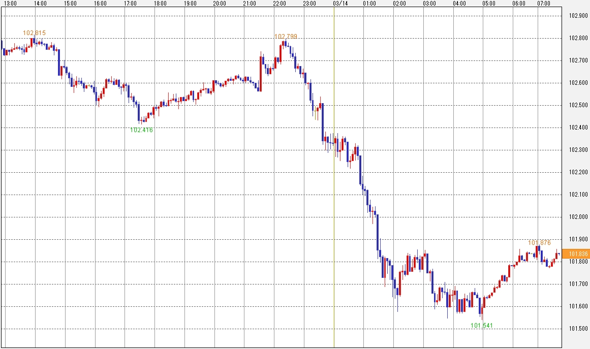 てなわけで、ドル・円相場は1円を超える急落となってしまいました。(米)2月小売売上高や(米)新規失業保険申請件数は好結果で103円手前まで強含む場面もあったのですが、株価が伸び悩んでいたこともあって上値は限定的でした。そして、冒頭でもお話したケリー国務長官の発言が伝わったことで急激にリスクオフムードが強まって、株価と米長期金利の下落もあり、リスク回避の円買いモード。102円割れ後はストップロスを巻き込みながら、101.50円台まで値を下げました。
