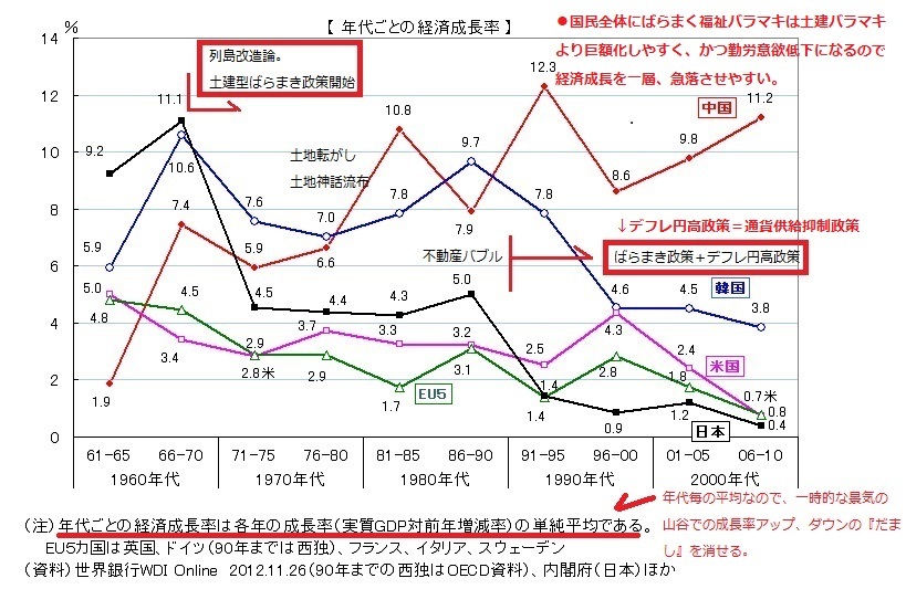 (補足) アベノミクスでは、当面の経済成長率は景気回復に伴い上がる。 それは、1990以降の気違い的な金融緩和抑制策(景気下押し政策)から、普通の金融政策(インフレ目標政策。物価上昇率=景気体温を2%程度のほどよいところに維持する政策)に大転換したからである。 しかし、バラマキ路線・増税路線はそのままなので、好不況ならしで見た経済成長は添付図1のごとく低落トレンドのままとなる。