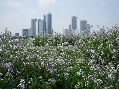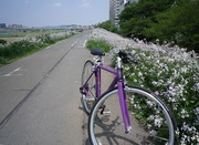 丸子橋からガス橋にかけて花(正体不明)が満開です。去年もあったのかな、覚えなし。