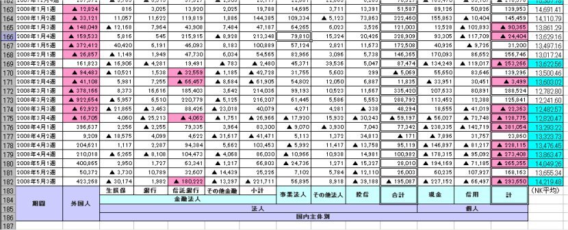 一番右欄はその週の日経の終値で先週比で上昇している時は