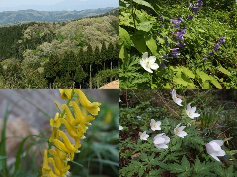 写真右上:ラショウモンカズラの青い花と一輪草の白い花