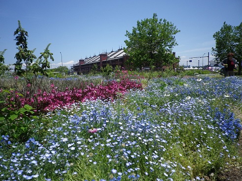 ↑さらに進むとお花畑の向こうに赤レンガ倉庫(普段よく見るのとは裏側になります)