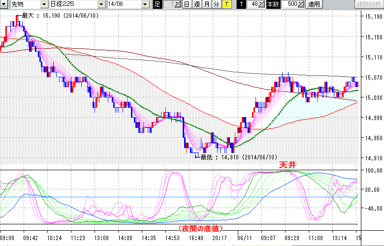 指標ラインの密集点が天底・転換点を示します。指標の見方
