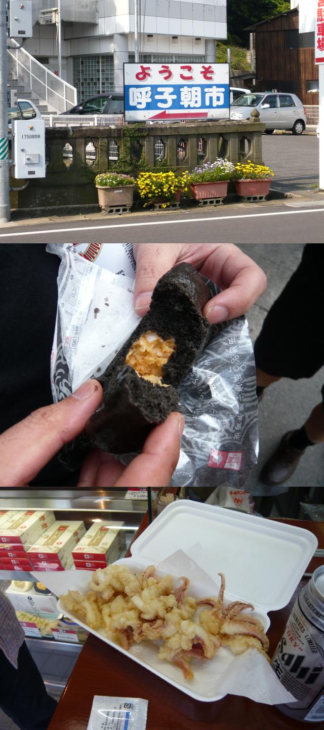 鯨の刺身や鯵の味醂干しイカ焼き、明太なんかを試食しながらビール片手に朝市を闊歩(写真右上)しているとウニ発見!これを早速裁いてもらい皆で食べますた(写真右中)新鮮で甘くておいひぃ~♪(^p^)