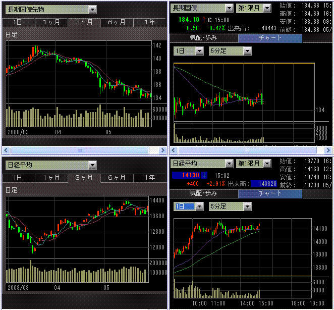 米株価指数は続伸。耐久財受注を好感、らしいですが、結局上がっているのは、エネルギーと素材。エネルギーは、原油価格の反発で上昇。素材は、モンサントとデュポンが、米農務省の将来の気候変動に関するレポートを材料視して上昇(遺伝子組み換え種子)。10年債利回りは、4%を超えました。住宅ローン金利も、せっかく低くなっていたのに、また上がってきています。住宅市場の回復が遅れるでしょう。(Yahoo!Financeのトップページの右下に、平均のローン金利が載っています)