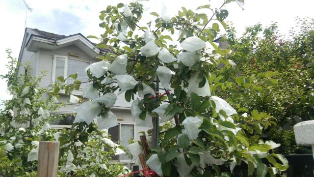 リンゴの木、見事袋の花が咲いていますね。![]()