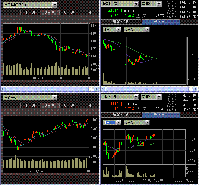 今日は、長期国債先物が134円を割れたことによって、ブレイク狙いの新規建てとブレイクされたことによるロスカットが入った感じです。それがペアトレードの形で株先物にも影響が出たと。それなりに現物にも買いが入っているんでしょうけど、ここ三日間の上昇は、先物の影響が強すぎてどう判断してよいか迷いますね。