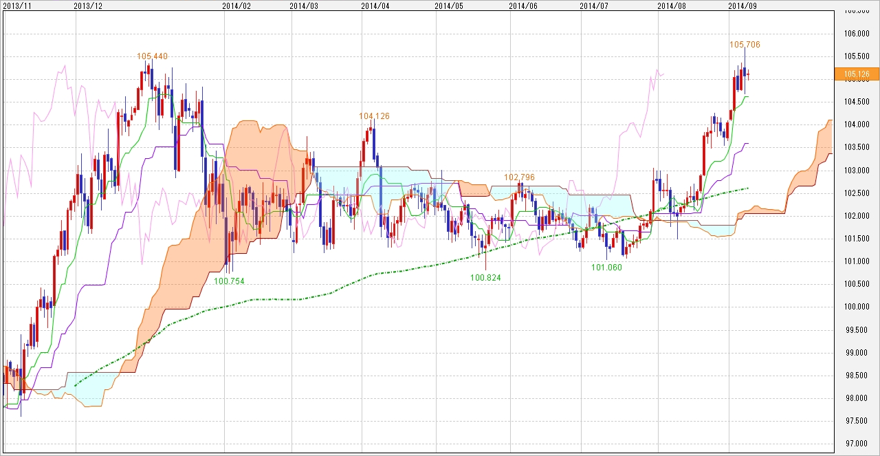 こうしてみると攻防のポイントとしては、上は年初来高値のある105.60~105.70円台を中心にピボットやボリバンといったテクニカルラインが集中しています。下は一目転換線やピボットが104.50~104.60円近辺にある状態です。