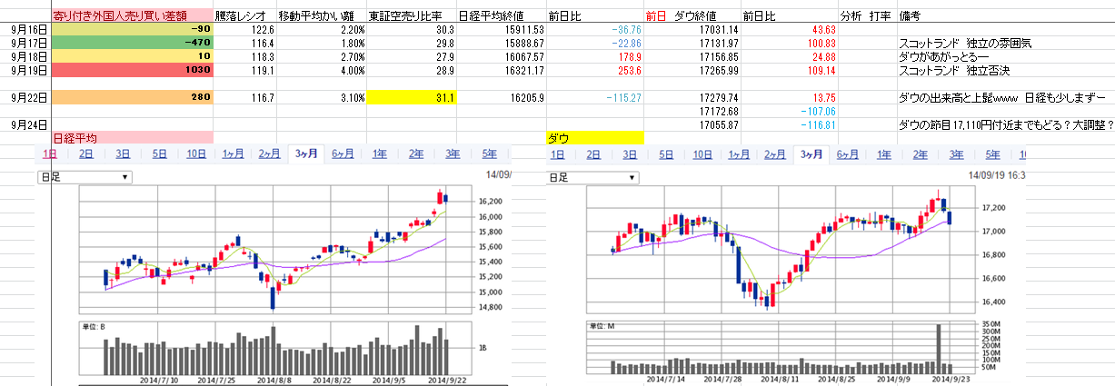 この数値を見ると まあ日経は過熱感はそれほどなかったけど、ダウの過熱感の調整によってつられて調整しているような感じでしょうか。かといって楽観はできない。ダウが前回のおっこった16400付近まで落ちるようなことがあったら日経はどの辺で止まるだろう。