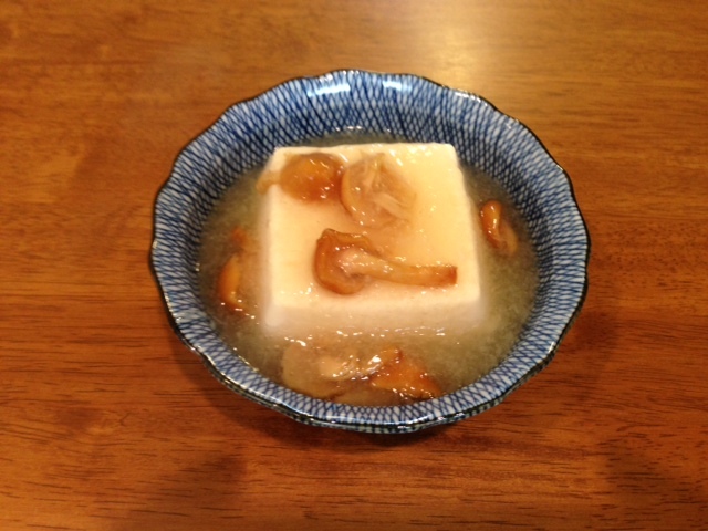 今回の秘伝だしは、水に、白だし(3)、酒(1)、みりん(1)の比率になります。だしの濃さは水の量でご調整下さい。だしに加えるものがあるため、この時点ではやや辛めの味付けにして下さりませ。このだしに、さっと洗ったなめこ、大根おろしを入れ、水溶き片栗粉を加えて熱していき、とろみがついてきたら、温まった豆腐に秘伝だしをかけて出来上がりでござります。