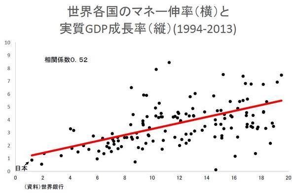 添付図は通貨流通量の伸び率(横軸。マネタリーベース伸び率)と経済成長率(縦軸。物価上昇率を差し引いた実質成長率)の関係を見たもの(高橋洋一氏作成)