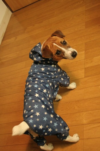 犬は頭が濡れるのが嫌みたいなので、レインコートのフード