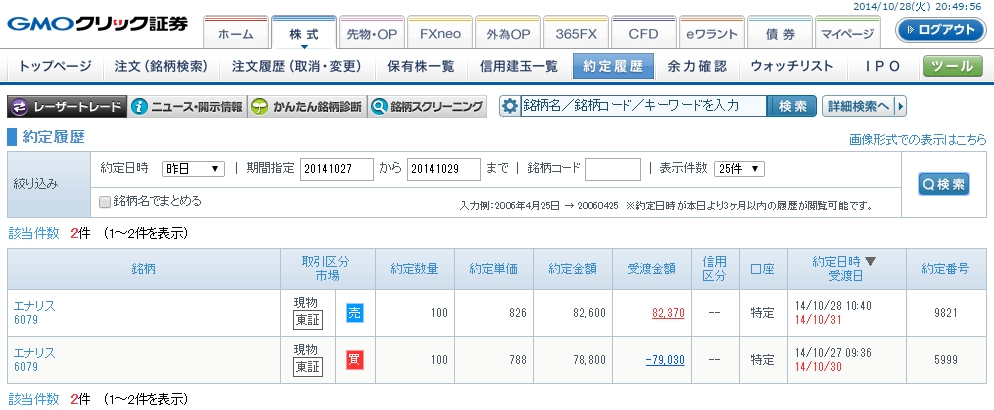 ↑エナリくんを27日に788円買い⇒28日に826円売り