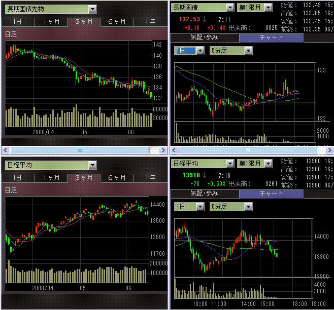 先週までは、何も考えていないCTA筋が、インフレだから単純に債券先物売り・株先物買い、と盛んにやっていた感じですが、それも下火になったようです。今の地合いですと、ポジション保持時間も値幅も短いトレードでチマチマ抜くしかなさそうです。