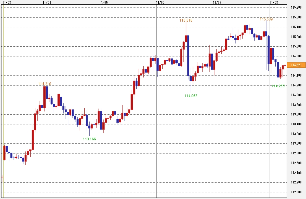 NY市場でも、ジワジワと買われ続けて114円手前まで上値を伸ばしてISM待ち。その後、今週のトップバッターである(米)10月ISM製造業景況指数が好結果となり、ついに114円台へ。同指標との強い相関が指摘された米長期金利(10年債利回り)が上昇したことも後押しとなった。ただ、株価が伸び悩んだこともあって終盤には値を落とした。