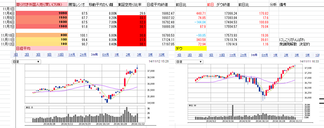 こうしてみていると、一気に上がった後遺症として売りが出てるけど、って感じでしょうか。しかし転落しない強さもある。恐らくダウは今日も小さな値動き。