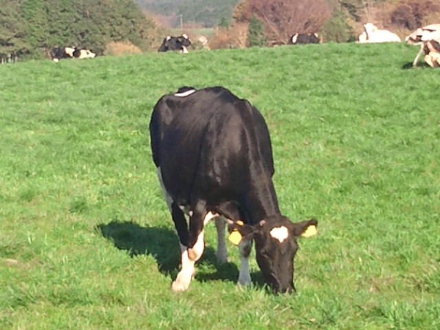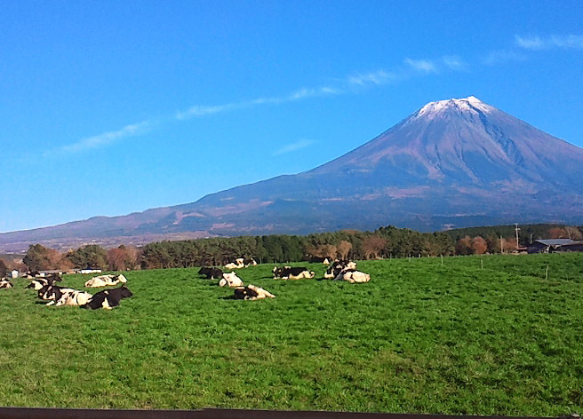 今日の富士山、雲がしたにあったり、また牛さんたちがその下で、休んでいる様子がなんとも