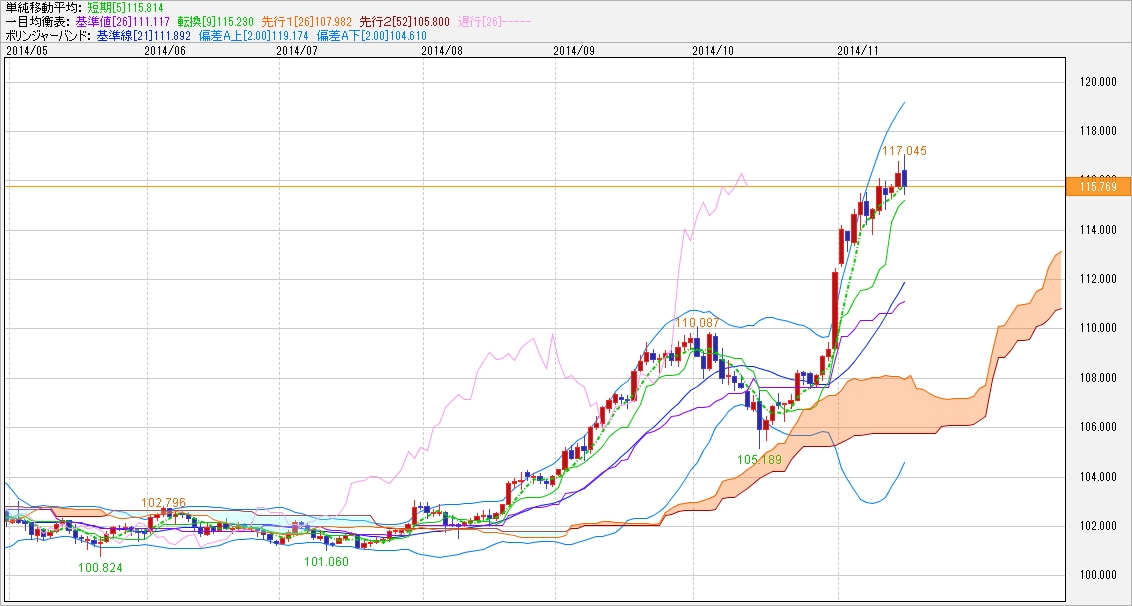 ↑ドル・円の日足チャート。5日移動平均線一目均衡表ボリバン