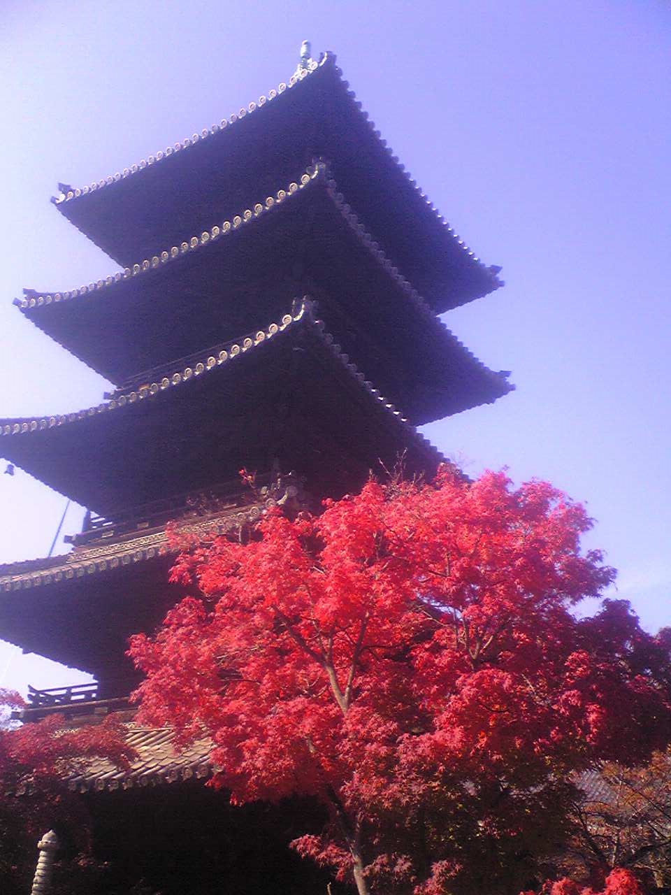 五重の塔とそのまわりに紅葉があり、ライトアップもされる。