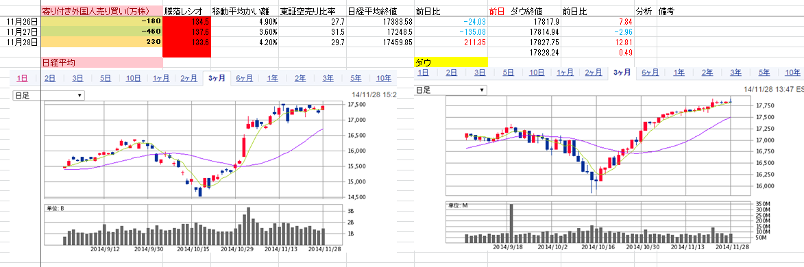 日経は力強い感じでしたが、ダウも日経ももう少ししたら大きく動き出しそうな感じ?25日線が近づいてきていますから、大きく動く一歩手前ってとこでしょうか。