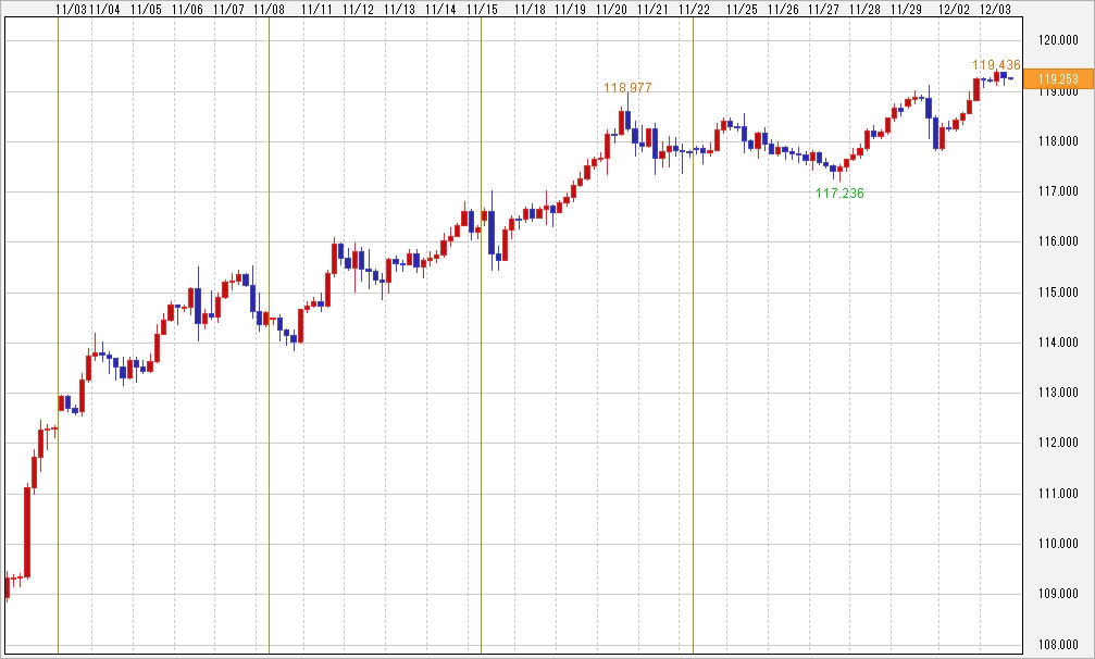 NY市場では、一段高とはならなかったものの119円台に定着しています。NYダウが小高く始まったことや、米長期金利の上昇、さらにフィッシャー副総裁の発言なども下支えとなりました。