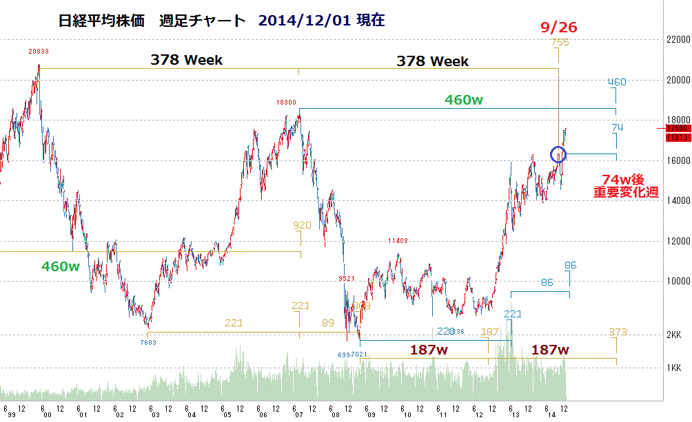 現在の日経平均の日柄を分析すると、74週後に起点の異なる187週や460週という非常に大きなスケールの変化日が一致します。