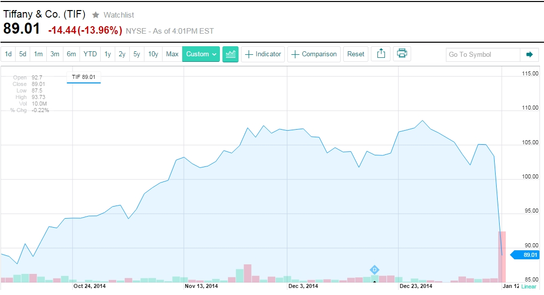で、このティファニーなのですが、なんと昨年(2014年)11月・12月の売上高が前年同期比で1%減少したと発表され、パニック売りが殺到して株価が暴落しました。