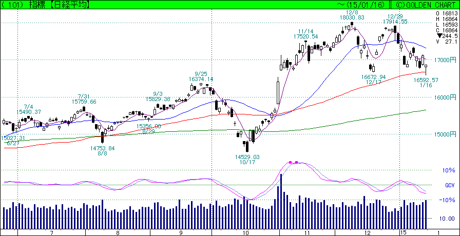 1月16日の日足は、長い下ヒゲがつき、終値も500円以上の下落から戻しました。