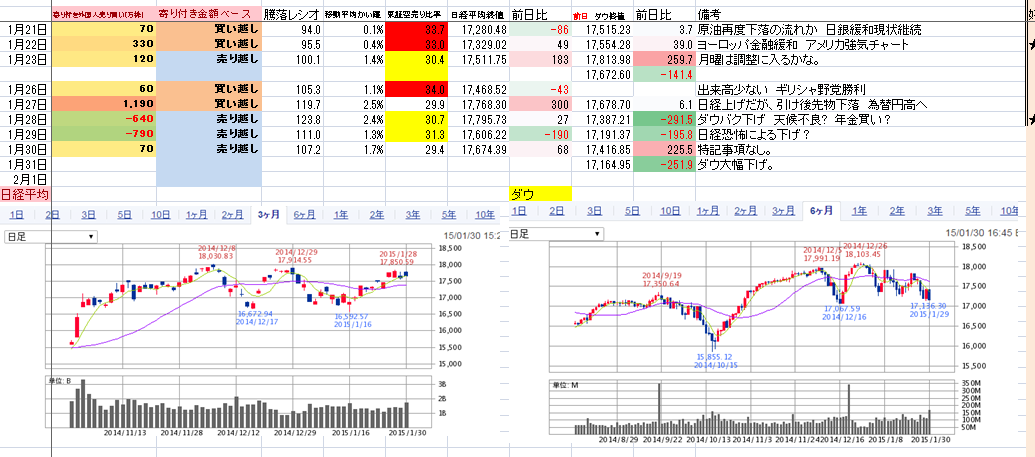 確かにダウは 調整するタイミング。ついこないだまで16000ドル付近で、高値更新と騒いでいましたからね。最近過剰に上がっていた調整と取れなくない。日経は調整しながらも 緩和等もあるのでダウほどは下がりにくいってことか。この流れを変える原動力となるのは、緩和ではなく、原油の価格の安定であるべきなんでしょうかね。なんか明るい材料の少ない、重苦しい雰囲気ですね。