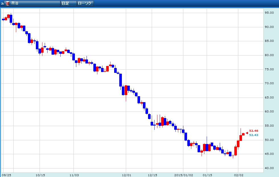 原油先物価格が先月末から急反発しています。1月30日、2月2日~3日の3日間で、約20%超も上昇する場面がありました。今日はやや勢いを欠いてはいますが、まだまだ堅調な動きは変わらずといったところでしょう:(;゙゚'ω゚'):