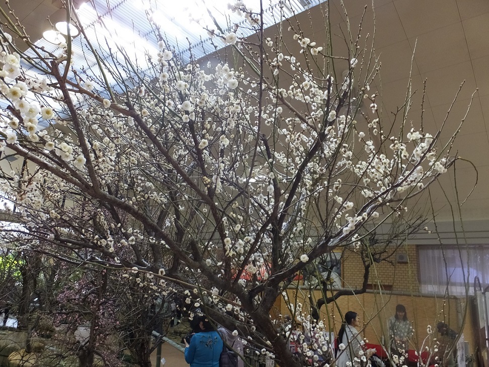 名城公園の梅まつり、展示棟での大規模な盆梅と掘り出した木の飾りと、
