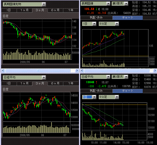 昨日とは逆に、債券先物買い・株先物売りが入り日経平均は大幅安。現物の商いが薄いので、先物に振り回されますね。先物手口を見ると、いつもの欧州系証券からの売り手口が目立ちます。最近は、それらに加えてリーマンからも同じパターンの注文が出てるっぽいです。