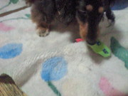 クゥタはタイガーマスクさんにもらった盲導犬協会の緑色の、ぴゅーぴゅーがお気に入りですが、