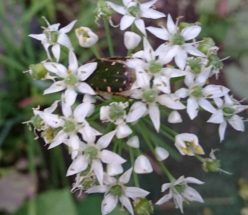 にらの花が咲き、コガネムシが寄ってきました。