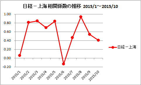 同様にして、日経平均ー上海の相関係数の推移です。