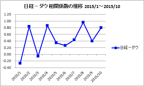 次に、日経平均とNYダウの月ごとの相関係数の推移をグラフにしてみました。相関係数は日足の終値で月末にその月の分を計算しています。市場によって祝日が異なるので、祝日はその前日の終値を採用。10月は半月分のデータしかありません。