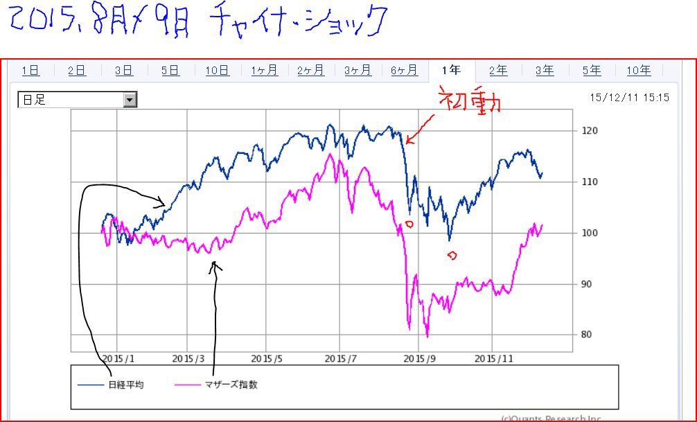 8月、9月チャイナ・ショックでの、チャート (日経平均、マザーズ)・・添付