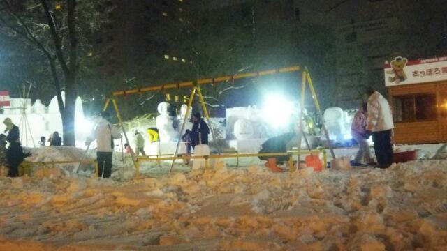 仕事帰りに市民雪像を手伝っていますが、造形の才能が無いので、雪像に触ることも許されず、削った雪を雪捨て場に運ぶだけの人足です。