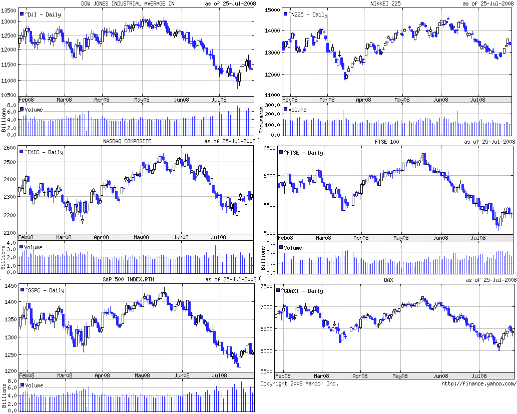 住宅関連の法案は、下院、上院で可決され、週明けにもブッシュ大統領が署名し成立するようです。法案の内容は、ファニーメイ、フレディマックの財務がまずくなった時に、財務省が株式取得を行い出資をすることが可能(公的資金の注入)、ファニーメイ、フレディマック向けの融資枠を拡大、返済が行き詰った住宅ローンを対象に米連邦住宅管理局が最大3000億ドルの借り換え支援、初めて住宅を購入する人に対し最大7500ドルの税控除、などです。住宅市場を反転させるカンフル剤というよりも、急激に悪化することを防ぐためのショックアブソーバーといった内容のようです。