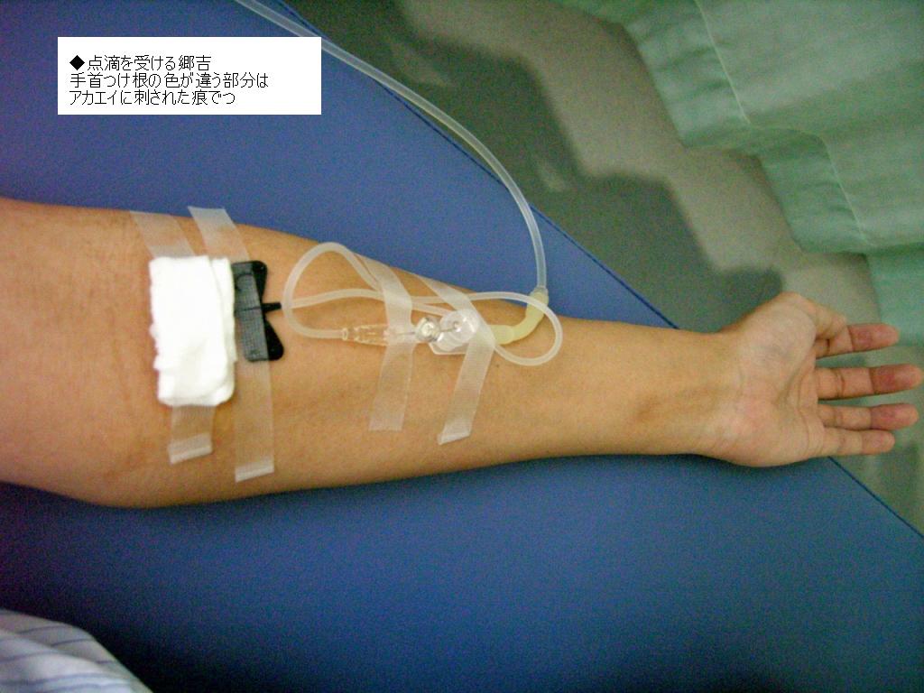 木曜日に体内へバイキンマンの珍入を許した郷吉は、ズキズキ攻撃に点滴プレーで対抗し土曜日には腫れもひいてきて、勝利目前でつ♪ハイ