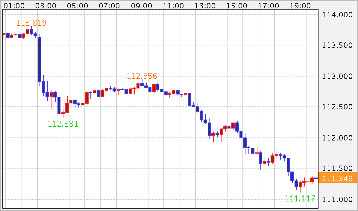 海外市場は、1ドル=112.30〜113.80円台でFOMCを受けて急落しています。欧州市場では、東京市場の流れを引き継ぐ形でドルが買われており、高値圏でのモミ合いが続きました。