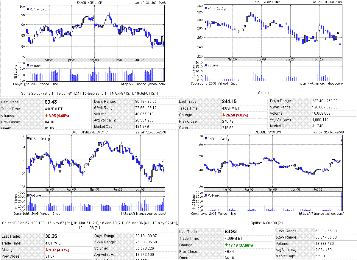 第2四半期GDPが予想を下回ったこと、新規失業保険の申請件数が予想を大幅に上回ったこと、エクソンモービルやディズニーが決算後に売られたことなどから、米株は大幅下落となりました。ナスダックに上場しているイムクローンが買収提示され大幅高になったため、ナスダック指数の下げ幅は小さかったです。原油価格は下落。長期金利は4%割れ。
