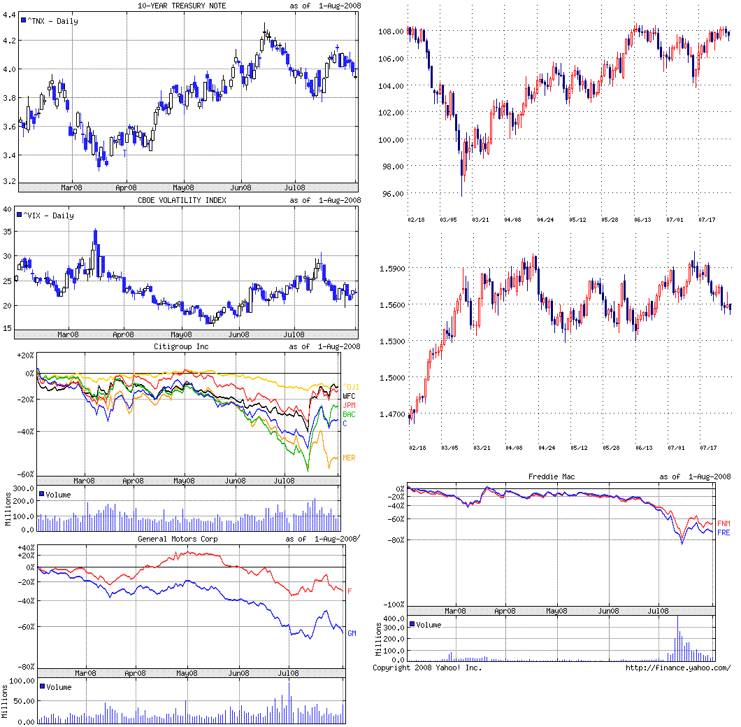 週間では、ダウは-0.39%、ナスダック指数は+0.02%、S&P500は+0.21%でした。週ベースでは前週末終値とあまり変わらない水準となりましたが、日毎ではダウが±200ドルを繰り返す、値動きの荒い展開でした。前週末に2行の地銀が破綻したことから、週初から大幅安。今週末もまた新たに1行が破綻しています(今年8件目)。メリルリンチがサブプラCDOを売却し資金調達を成功させたことから、火曜日は大幅高。ADPの雇用者数が予想外のプラスになったことから水曜日も大幅高。木曜日は、第2四半期GDPの伸び率が予想を下回ったことから大幅安。金曜は、GMの大赤字決算が出るも、雇用統計が予想から大きく外れなかったことから、比較的マイルドな下げ幅で終わりました。