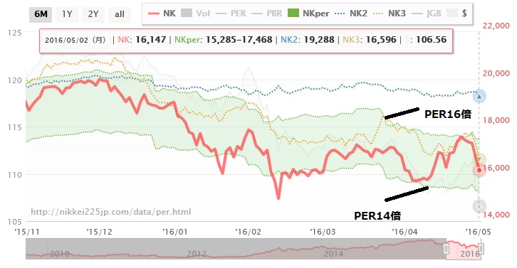 一般的にPERは14-16倍で推移するといわれていて、その水準が緑色のレンジで示されている。