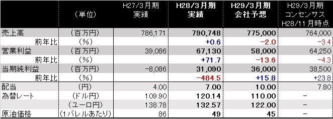 減収も原料価格低下と構造改革効果で大幅増益だが、見通しでは減益を予想。