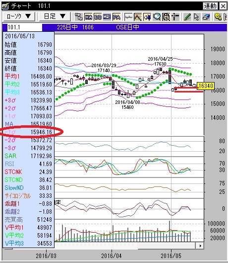 -マイナス1σ及び5/2、5/6の安値近辺の16000円前後まで下がる可能性もある