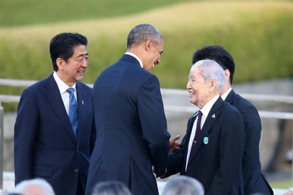 朗らかにオバマ氏と話す被爆者の横で、阿部さんも優しい笑顔。