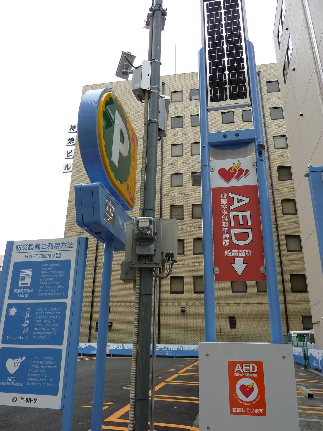 災害時には、柱の下に取り付けられたコンセントを利用して、携帯電話の充電などに使うことができます。