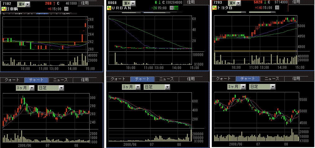 米株高を受けて日経平均も反発。夏休みシーズンに加えて、今日は韓国、インド市場が休場だったこともあり、商いは閑散でした。東証一部出来高は17.8億株、売買代金は1.6兆円。アーバンの出来高が3.4億株あるので、実質的な出来高はすごく低い水準です。業種別では、バルチック指数の上昇により海運株が高かったです。円安で自動車も高かったです。原油安により資源関連が弱かったです。それとディフェンシブ銘柄も朝から売られました。
